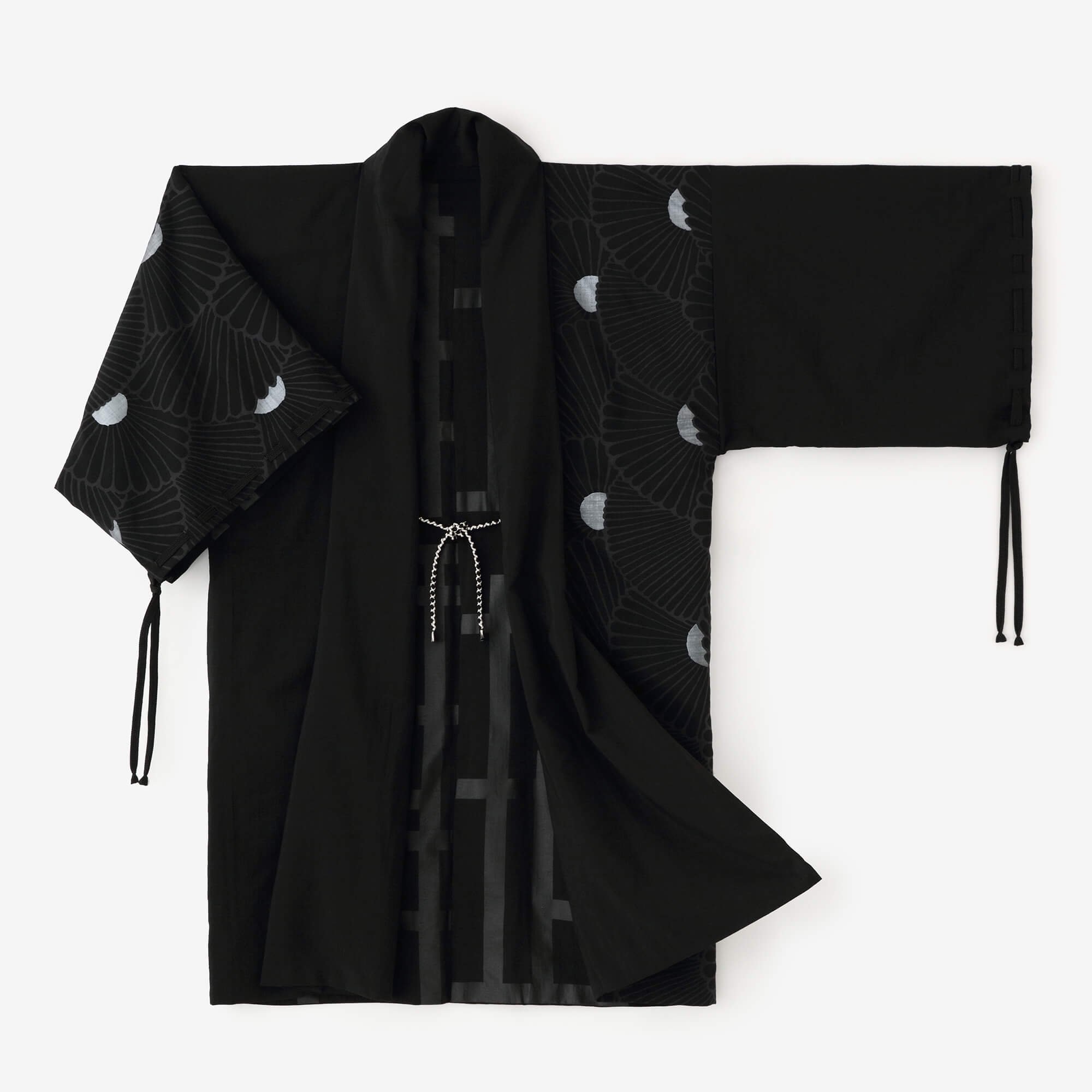 SOU・SOU:宮中袖 片身替わり 袷 モスリン/濡羽色×菊扇×桟
